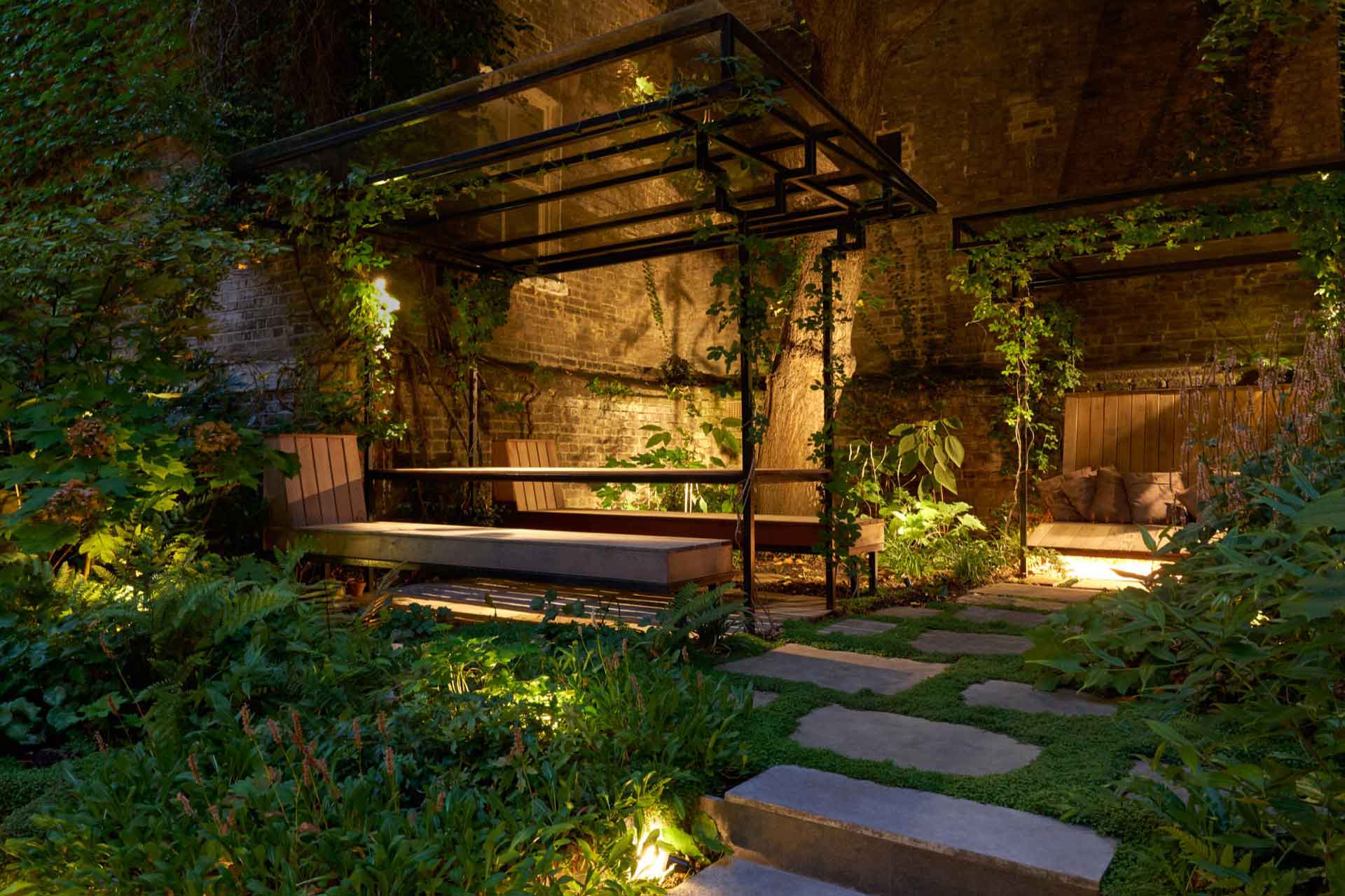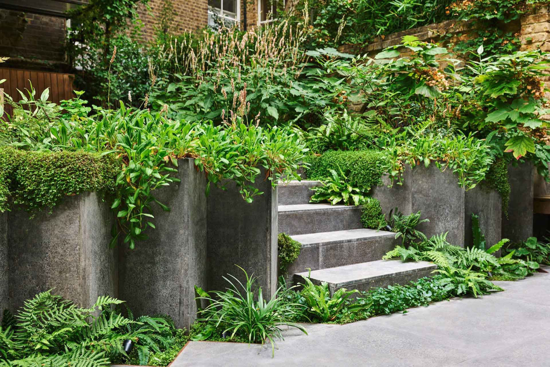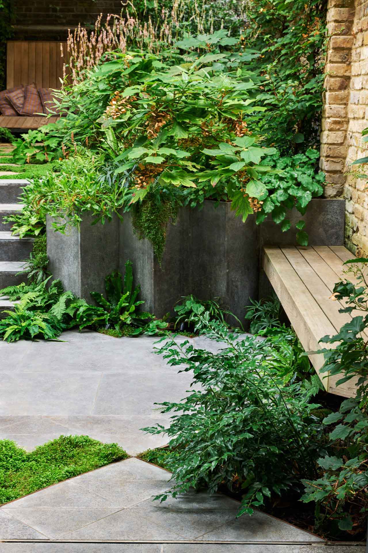 In this garden, designed by Adolfo Harrison, the main garden structure was installed by the builder and we installed the upper paving, steelwork benches, day bed and carried out the soft landscaping. The garden has a large mature tree in it which dominates the space and removes a lot of natural light so clever use of shade tolerant species and the use of plants to soften the hard angular build makes for an inviting space, with the seating and day bed protected by their own roofs. Maintenance of gardens like these are crucial to their success as the debris from the tree and the shade mean that careful tidying and plant care are essential!