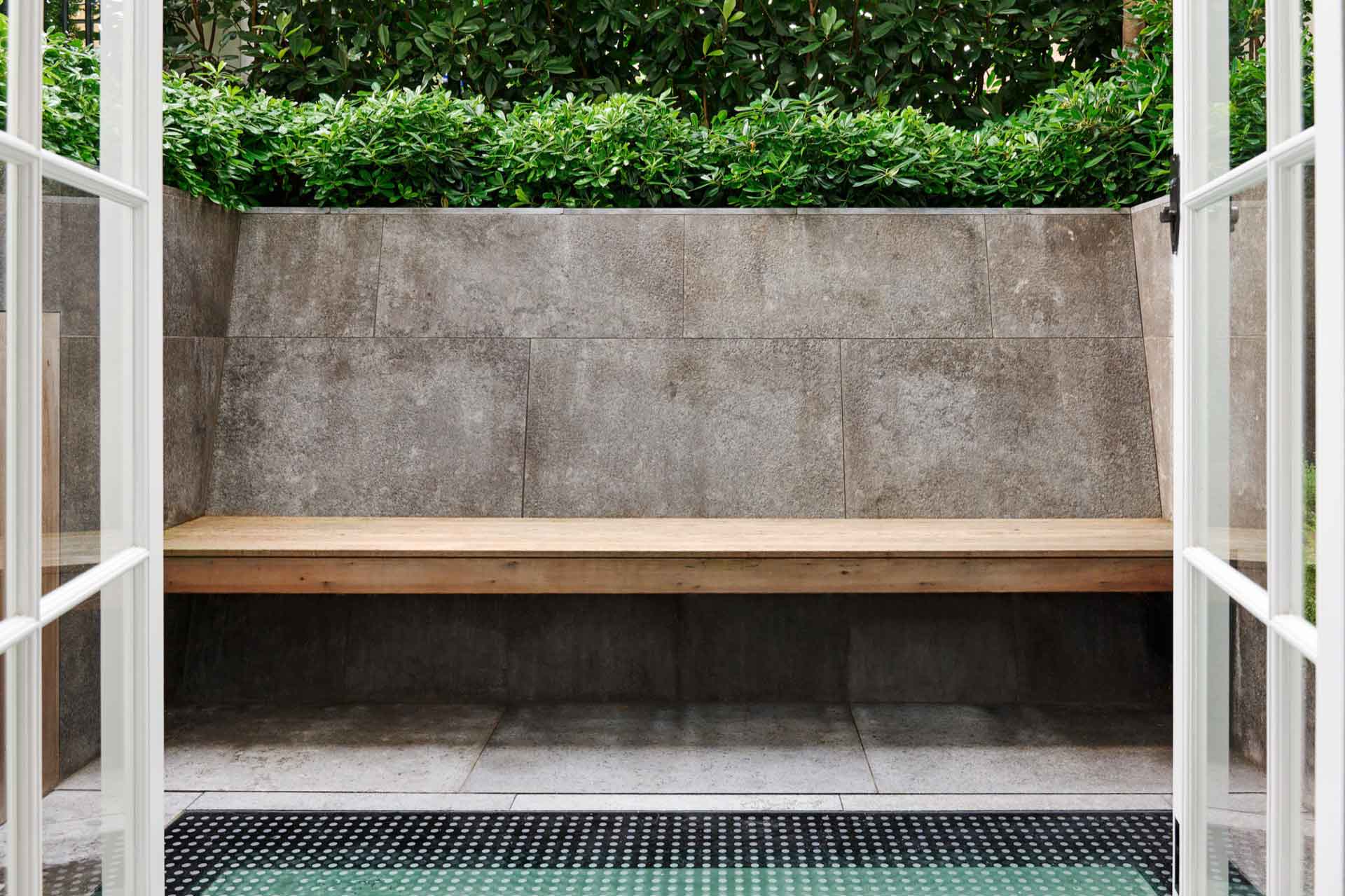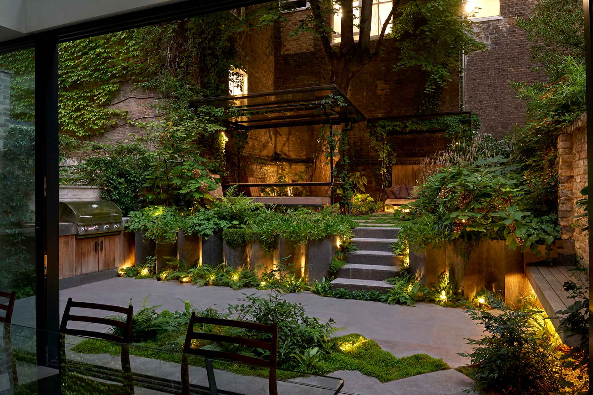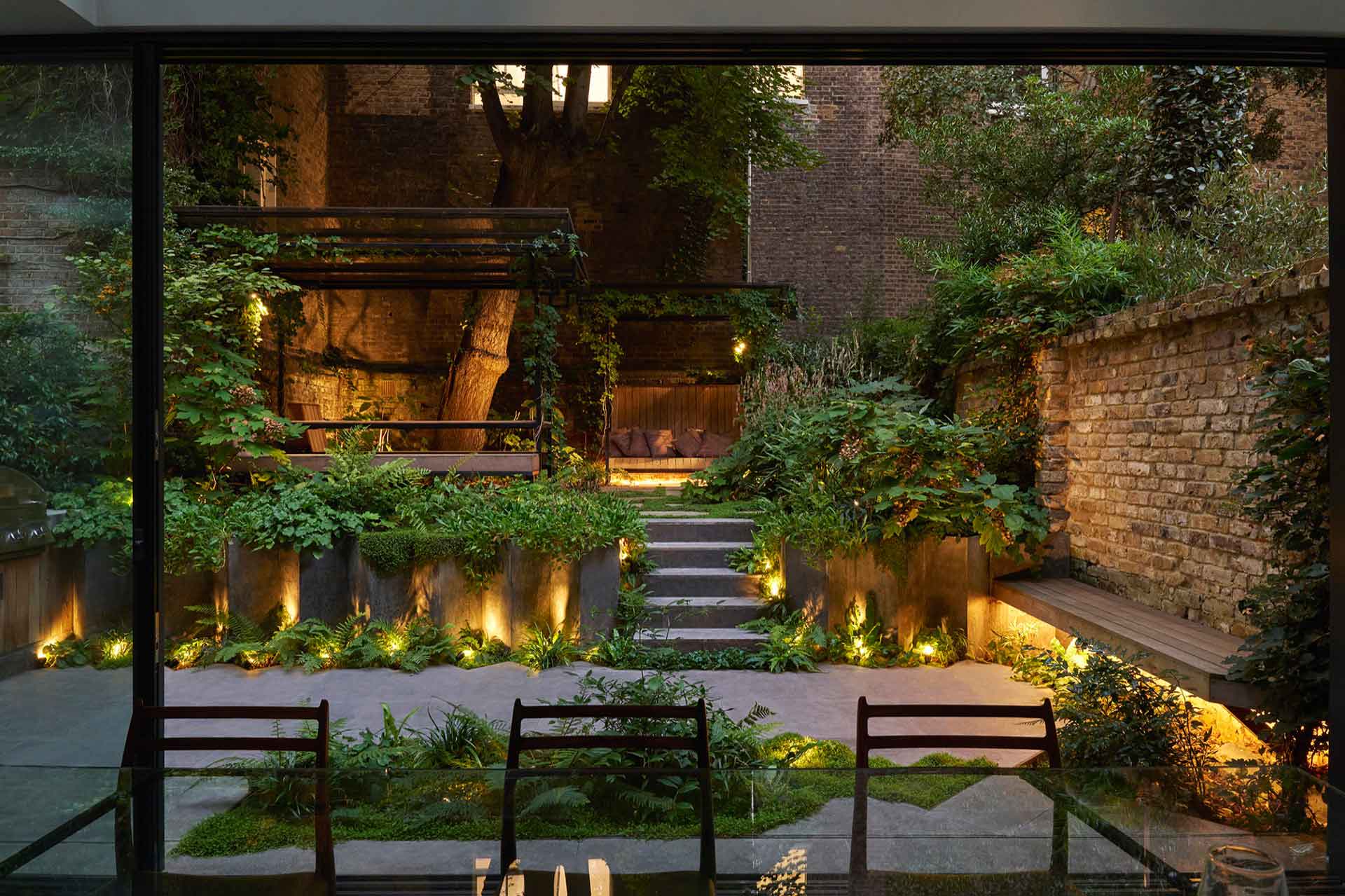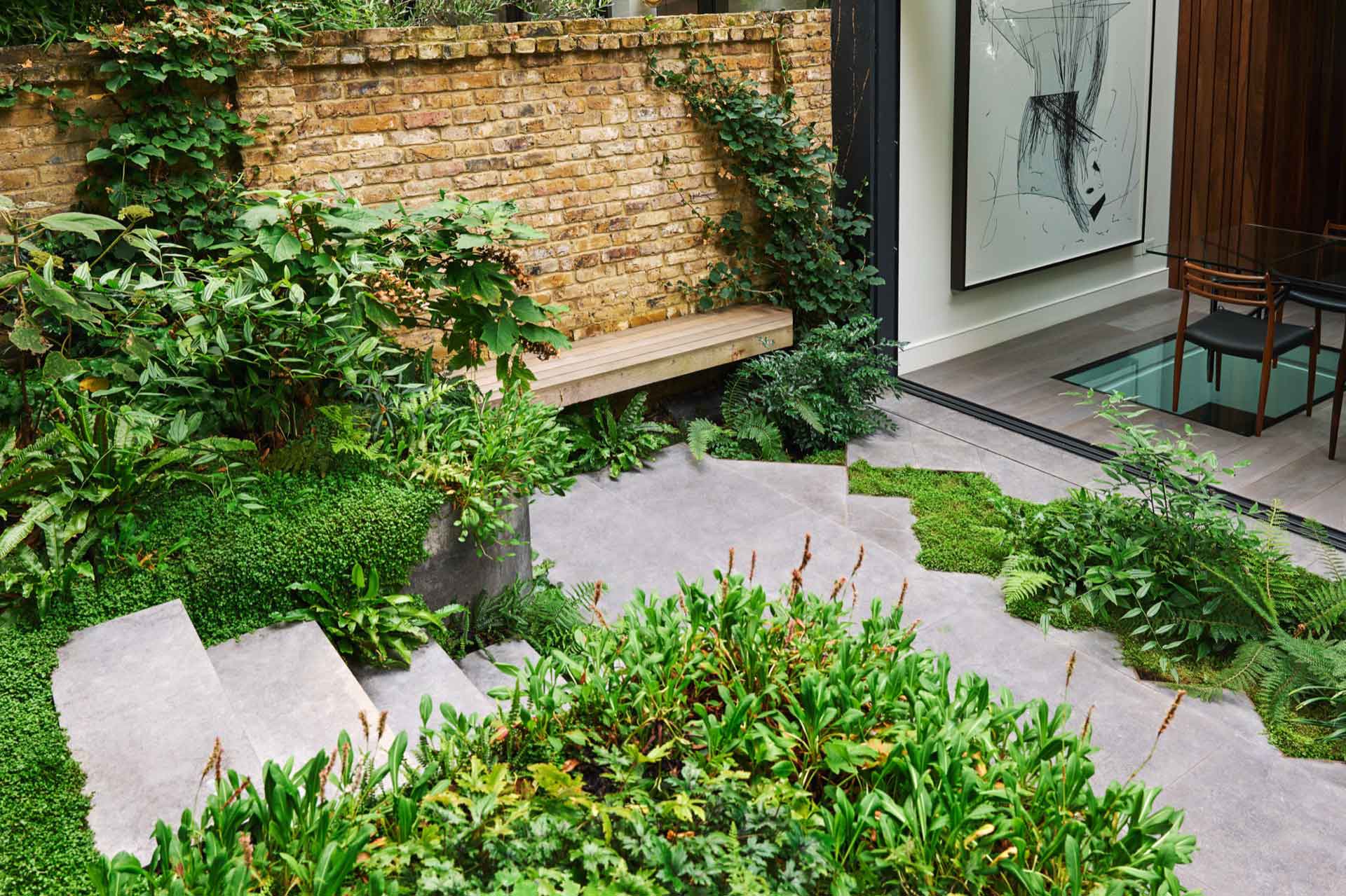In this garden, designed by Adolfo Harrison, the main garden structure was installed by the builder and we installed the upper paving, steelwork benches, day bed and carried out the soft landscaping. The garden has a large mature tree in it which dominates the space and removes a lot of natural light so clever use of shade tolerant species and the use of plants to soften the hard angular build makes for an inviting space, with the seating and day bed protected by their own roofs. Maintenance of gardens like these are crucial to their success as the debris from the tree and the shade mean that careful tidying and plant care are essential!